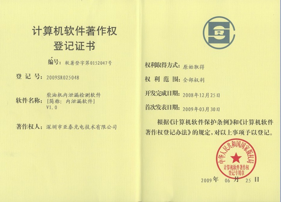 亚泰光电首页 >> 走进亚泰 >> 亚泰光电资质荣誉 >> 软件著作权德彩网 >> 柴油机内泄漏检测软件