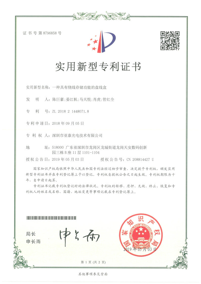 亚泰光电首页 >> 走进亚泰 >> 亚泰光电资质荣誉 >> 实用新型专利德彩网 >> 一种具有绕线存储功能的盘线盒一