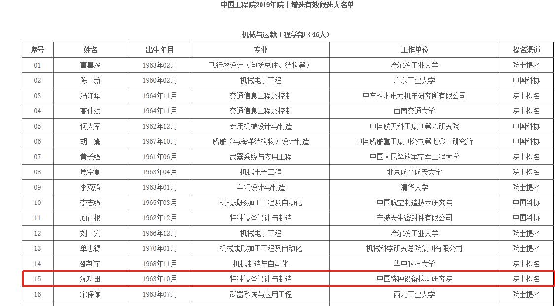 据悉:中国工程院2019年院士增选候选人提名工作于3月31日结束。经中国工程院主席团审定,最终确定的有效候选人共531位。中国机械工程学会无损检测分会理事长沈功田先生入选增选有效候选人名单。