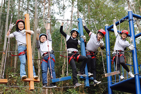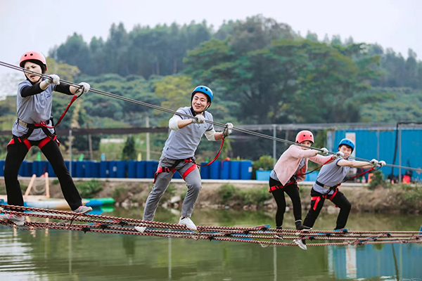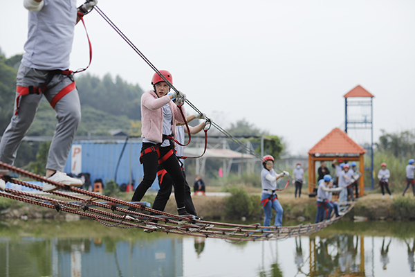 野炊结束午间休息后,年会进入到下半场,下午两点开始,所有队员在教练的指导下抖擞精神、重新整装再出发,开始丛林穿越、高空溜索、飞夺泸定桥等项目,随着高空溜索、飞夺泸定桥等项目的展开,各个小组发挥各自的优势努力完成每一个项目,每个项目的进行和完成极大的锻炼了团队成员的坚强意志、增强了大家的团队凝聚力和整体向心力,同时每一个人也感受到了团队合作与沟通的重要性。