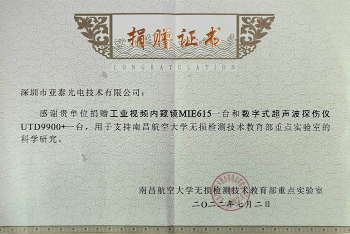 据悉,本次捐赠的两台设备为亚泰光电工业视频内窥镜MIE615和数字式超声波探伤仪UTD9900+,价值约6万元。工业视频内窥镜MIE615是一款机械360°转向视频内窥镜,用于各种狭小空间的目视检测工作。机身轻便便于携带,插入管可更换结构,一台主机可搭配不同规格直径的插入管,既满足了客户多方面的使用需求,又可以大大节约设备费用。可广泛应用于发动机、电力、石化、铁路、船舶等领域。数字式超声波探伤仪UTD9900+它能快速低成本地探测工件内部裂缝,夹杂,气孔,疏松等多种缺陷,广泛用于机械制造,钢结构,化工设备,造船,压力容器等领域进行质量控制的有力工具。它较好地解决了有些数字式仪器操作不方便的问题。