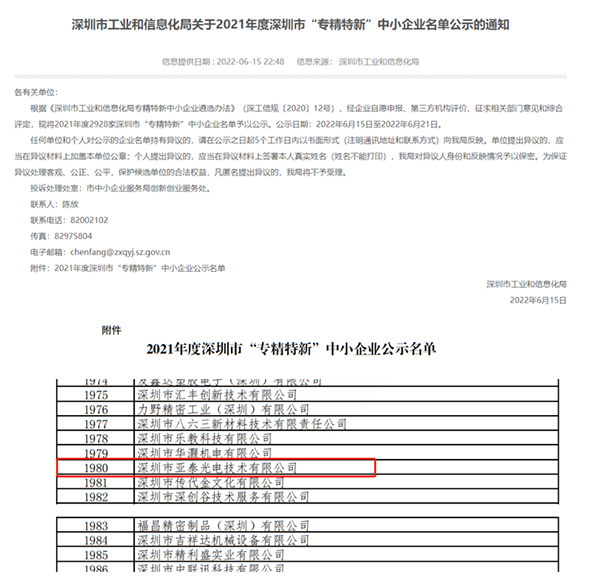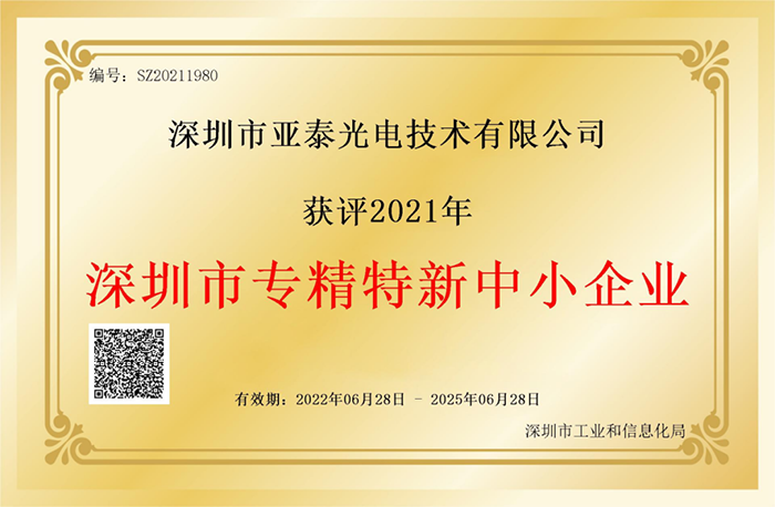 深圳亚泰光电经过五年的披荆斩棘与风雨兼程,凭借着行业的专业性、管理体系的完善性及强大的研发创新能力,获得了2021年度深圳市“专精特新”中小企业殊荣。