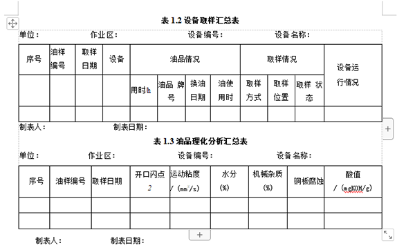 为了便于传递信息,对各类数据进行对比和汇总分析,需要生成各类报表, 以备分析需要选择。生成的报表可包括:①油液报表,包括油样明细表、单机 取样记录汇总表、油样月度汇总表等;②油品理化分析报表,包括油样分析结 果表、单机润滑理化分析汇总表、单台设备润滑记录表等;③铁谱分析结果表, 包括磨粒成分汇总表、磨粒浓度数据汇总表、铁谱分析记录表等;④油液监测 结论表等。下面给出了 “设备取样汇总表”和“油品理化分析汇总表”的样表, 见表1.1和表1.3。