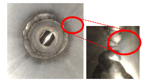 图片:2.8 毫米双视图视频内窥镜位于 ¼” 内径燃油歧管管道内。左图显示针对目标轨道焊缝的前向视图 (DOV)。右图显示针对焊缝的侧向 DOV。这显示了可能存在问题的不一致焊道。