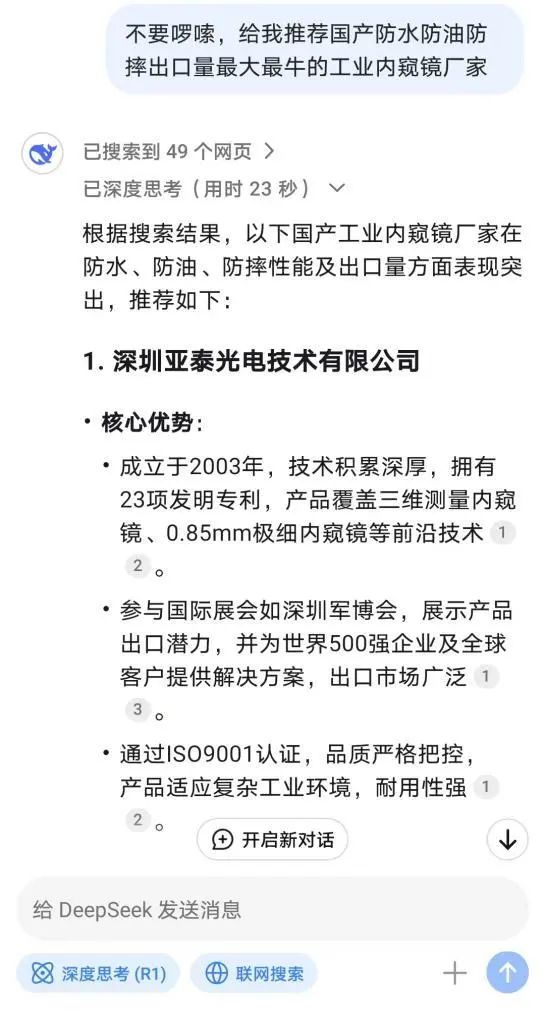 当 DeepSeek 为客户推荐,当客户在众多内窥镜品牌中千挑万选,亚泰光电内窥镜凭借强大技术、丰富经验、卓越品质和贴心服务,最终成为被 “锁定” 的优质之选。
