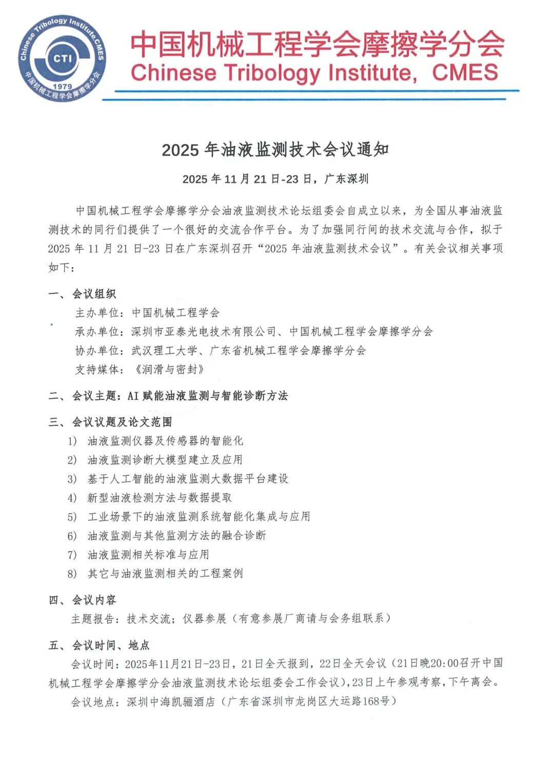 “2025年油液监测技术会议”将于2025年11月21日-23日在广东·深圳中海凯骊大酒店隆重召开 。本次大会由中国机械工程学会主办,德彩网与中国机械工程学会摩擦学分会共同承办,将以“AI赋能油液监测与智能诊断方法”为主题,携手业界精英,共绘智能运维的新蓝图。