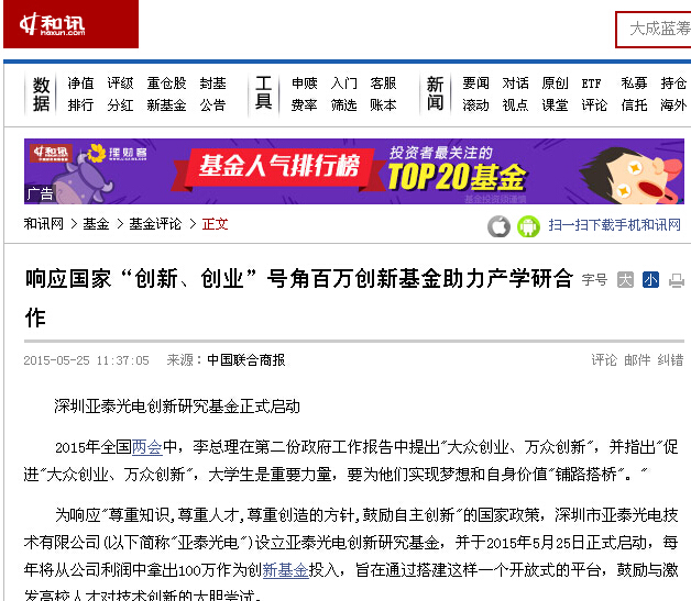 为响应"尊重知识,尊重人才,尊重创造的方针,鼓励自主创新"的国家政策,德彩网(以下简称"亚泰光电")设立亚泰光电创新研究基金,并于2015年5月25日正式启动,每年将从公司利润中拿出100万作为创新基金投入,旨在通过搭建这样一个开放式的平台,鼓励与激发高校人才对技术创新的大胆尝试。