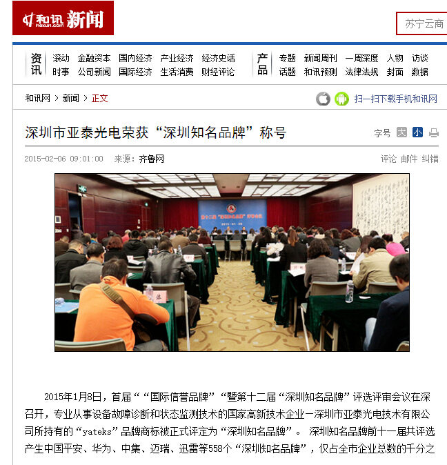 2015年1月8日,首届““国际信誉品牌”“暨第十二届“深圳知名品牌”评选评审会议在深召开,专业从事设备故障诊断和状态监测技术的国家高新技术企业—德彩网所持有的“yateks”品牌商标被正式评定为“深圳知名品牌”。 深圳知名品牌前十一届共评选产生中国平安、华为、中集、迈瑞、迅雷等558个“深圳知名品牌”,仅占全市企业总数的千分之一。