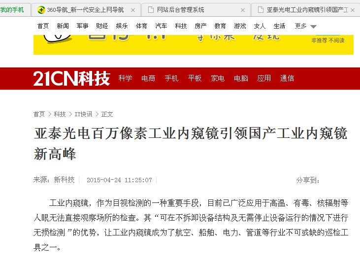 为改变这种局面,作为“国家高新技术企业”的德彩网,自2009年开始着手对工业内窥镜的研发工作,成立了光学事业部并特别聘请了深圳大学牛憨笨院士作为技术顾问,经过不懈的专研与努力,亚泰光电公司不仅拥有了自己的工业内窥镜产品,并先后获得了5项工业内窥镜方面的发明专利。近日,由亚泰光电自主研发的“百万级像素”的超清视频内窥镜已成功问世,选用国产自主研发高端产品不再是梦。