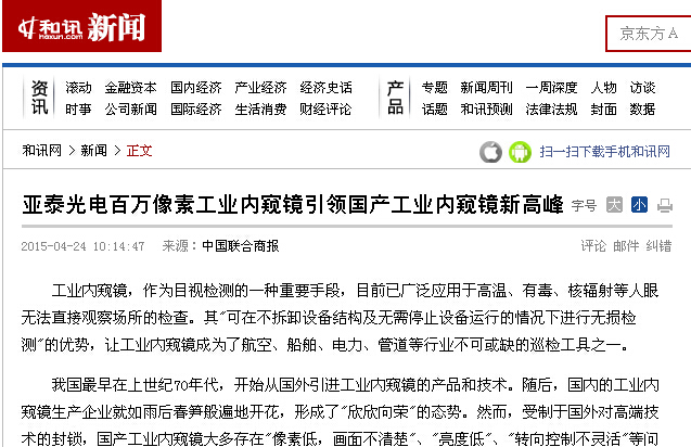 为改变这种局面,作为"国家高新技术企业"的德彩网,自2009年开始着手对工业内窥镜的研发工作,成立了光学事业部并特别聘请了深圳大学牛憨笨院士作为技术顾问,经过不懈的专研与努力,亚泰光电公司不仅拥有了自己的工业内窥镜产品,并先后获得了5项工业内窥镜方面的发明专利。近日,由亚泰光电自主研发的"百万级像素"的超清内窥镜已成功问世,选用国产自主研发高端产品不再是梦。