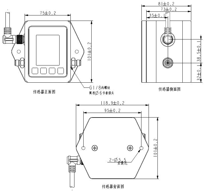 传感器机箱的外形以及安装孔尺寸图 单位:mm